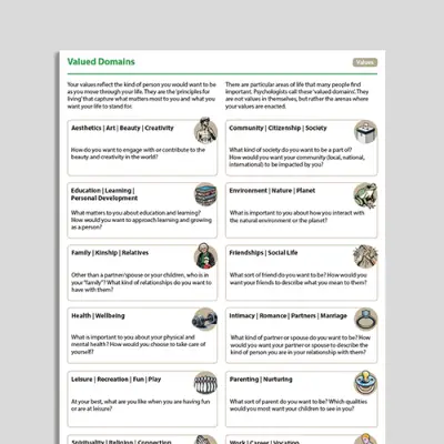 Valori e gli ambiti della vita si confondono facilmente. I valori sono i principi personali che definiscono ciò che è importante per qualcuno, come essere onesti o aiutare gli altri. I domini di valore sono le aree della vita in cui i valori entrano in gioco – come la famiglia, le relazioni intime, il lavoro e la vita spirituale (Simon, Howe Valori: Connecting To What Matters guida (e la versione gratuita: Un'introduzione ai valori ), abbiamo creato due nuove risorse per aiutare i terapisti a spiegare ed esplorare ambiti di valore con i loro clienti.